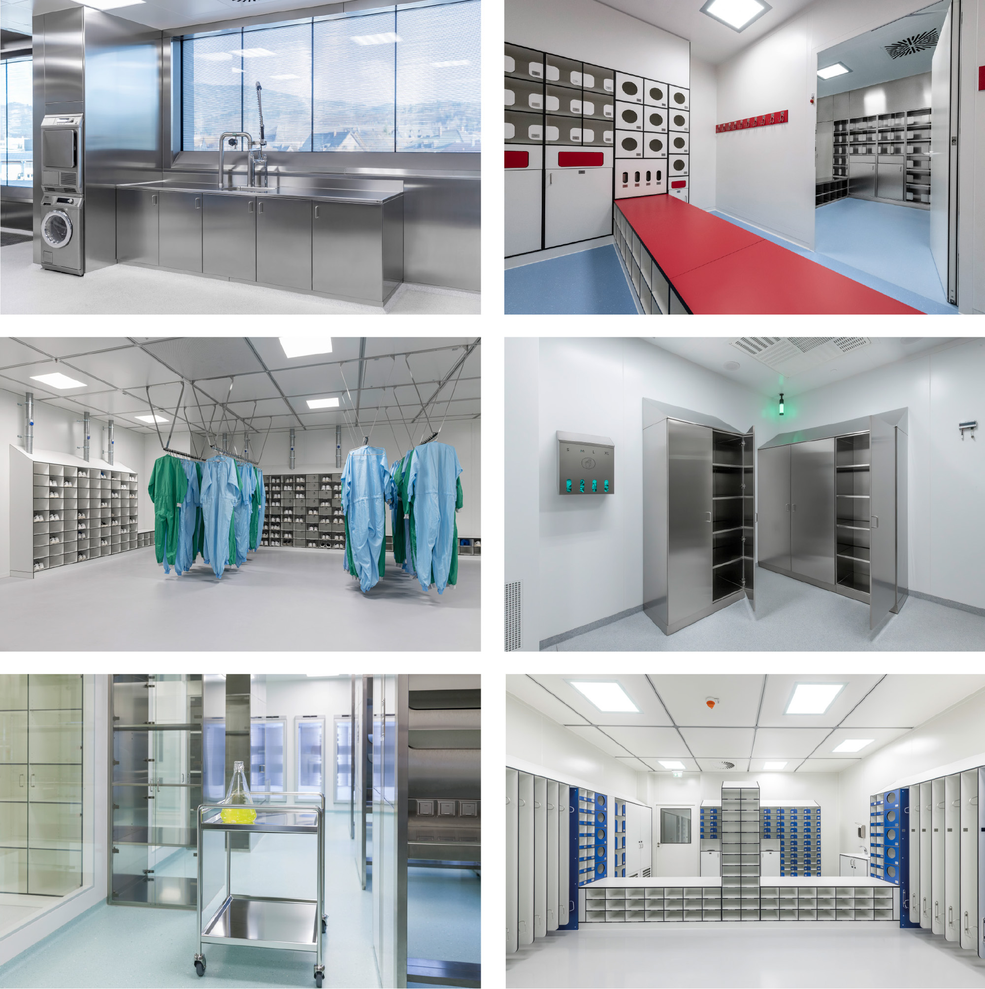 - Einrichtung von Personalschleusen (Sit-over-Bänke, Kleiderspinde, Garderoben, Spender, Entsorgungslösungen)